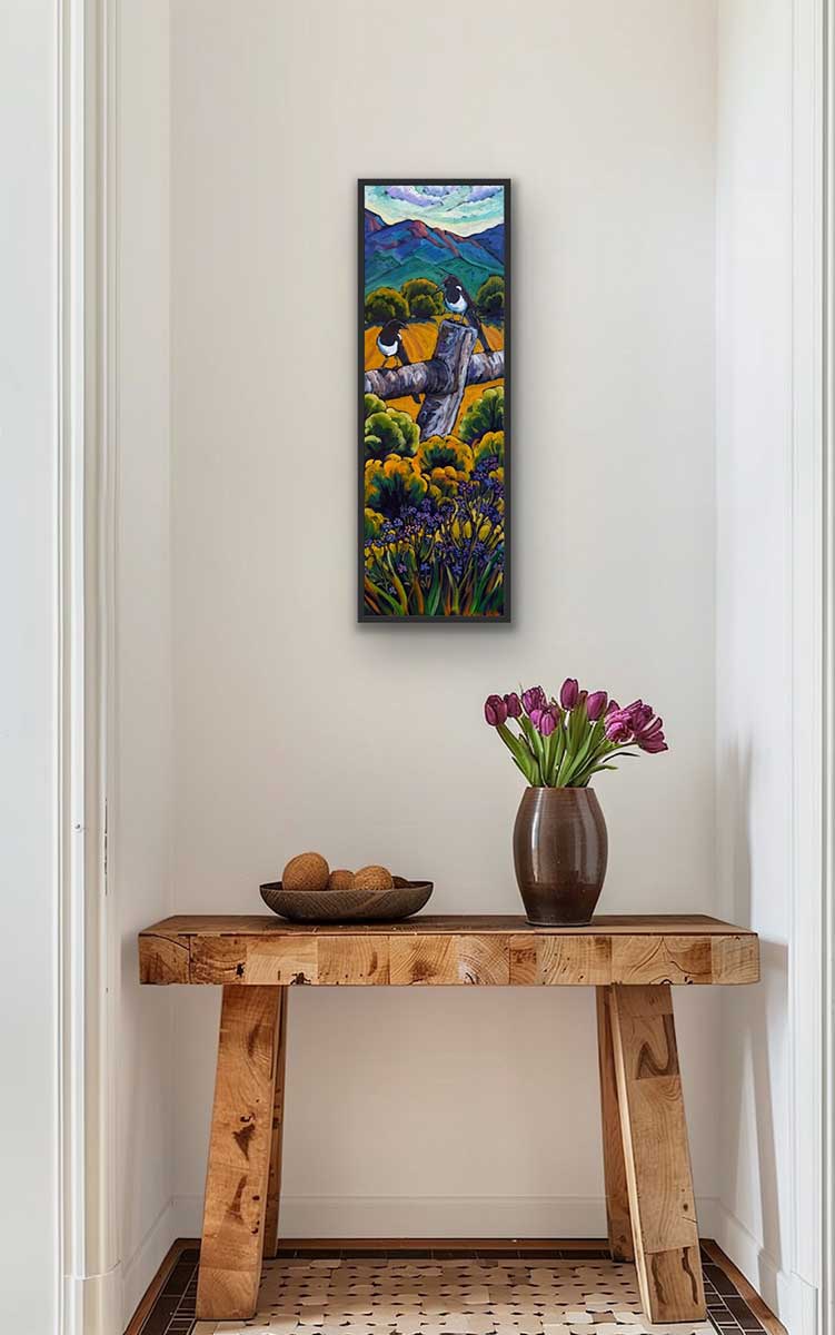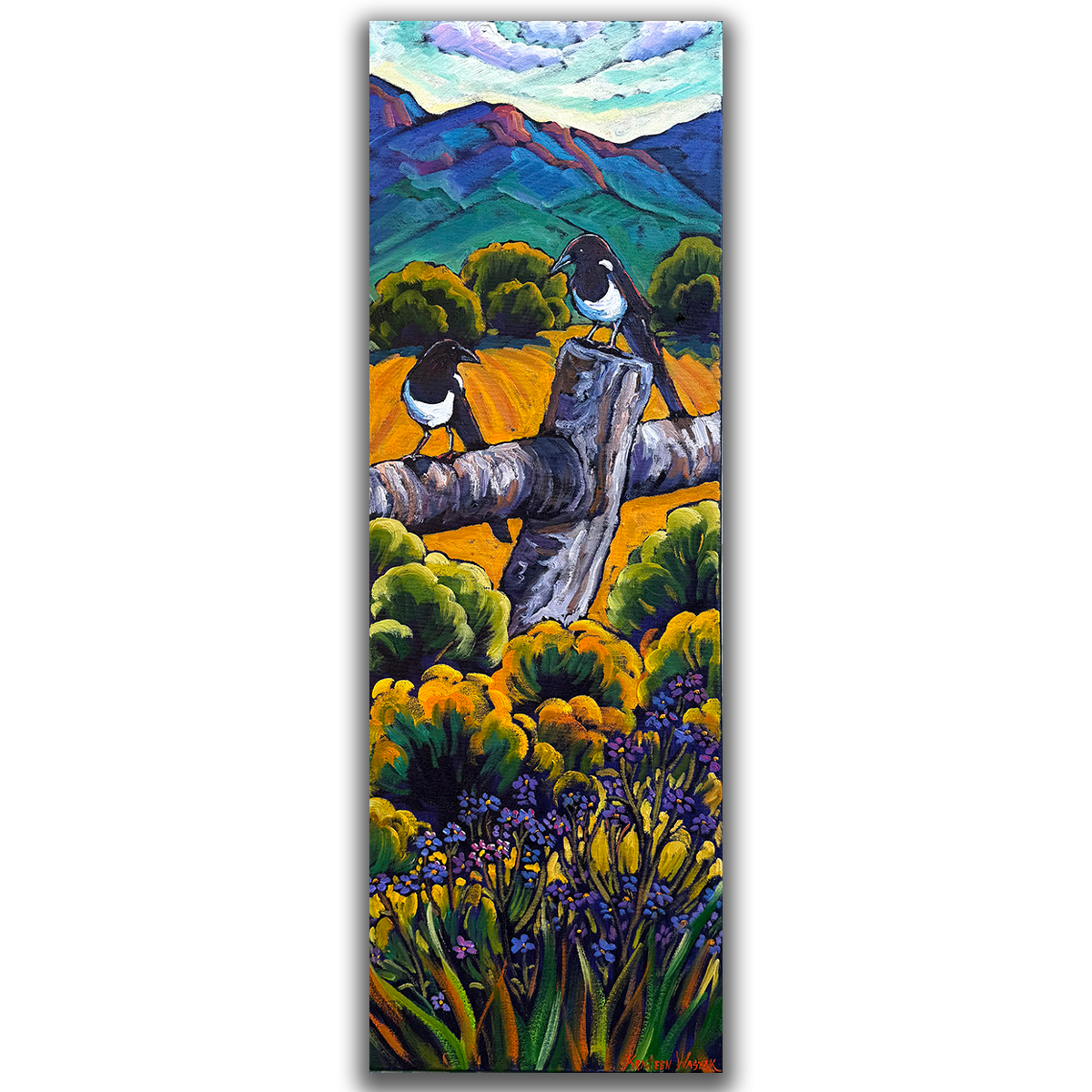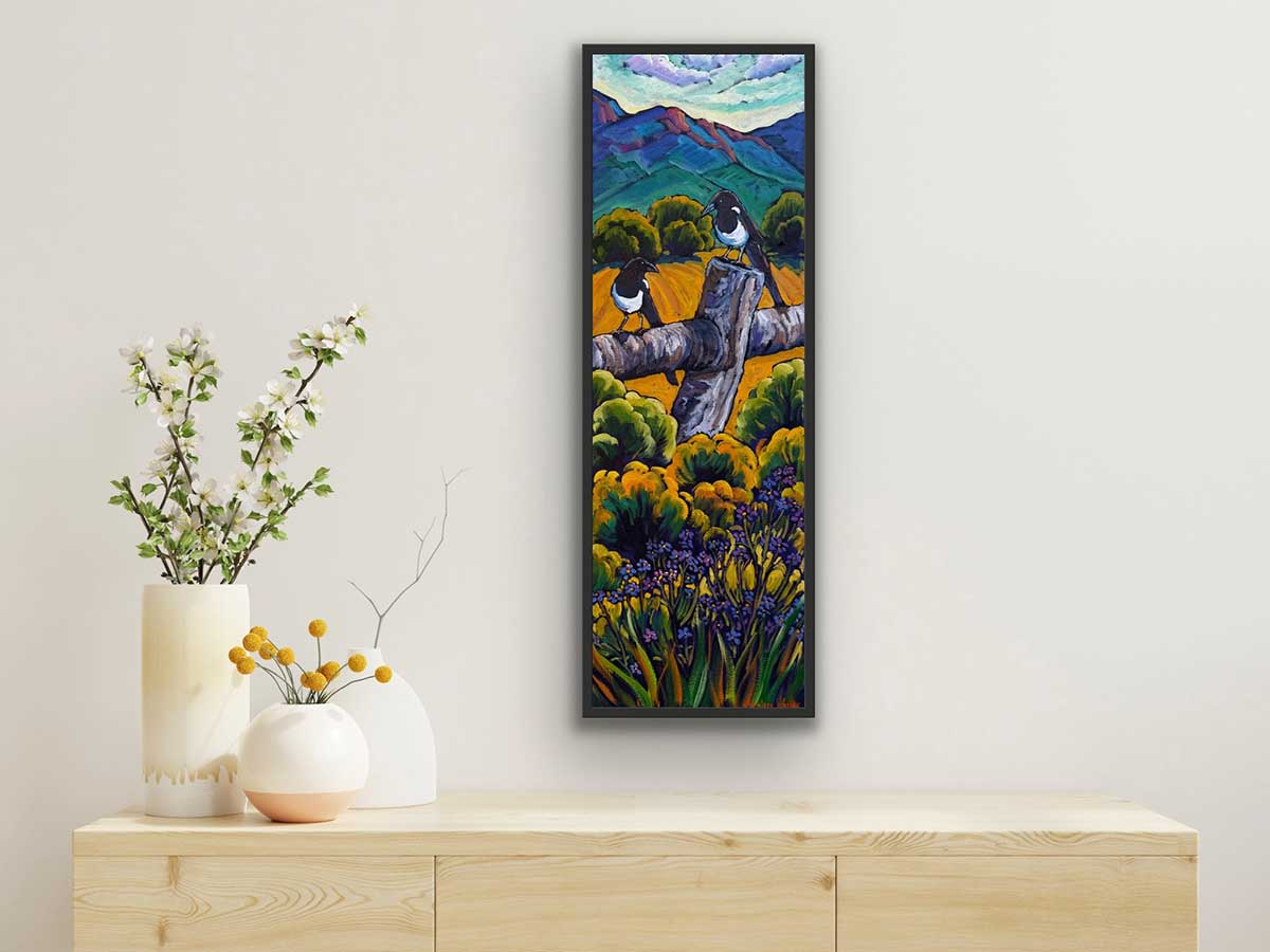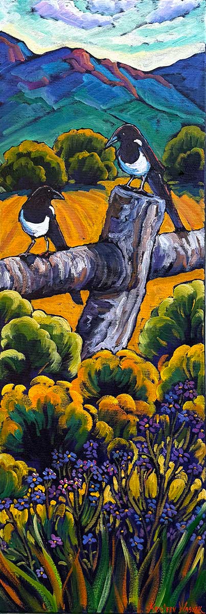 Oil on Canvas – Magpie Chatter 12×36 I love magpies, (all birds actually) every chance I get to observe them I do. This long tall format of a painting is really nice to live-en up a space or wall with color and energy!