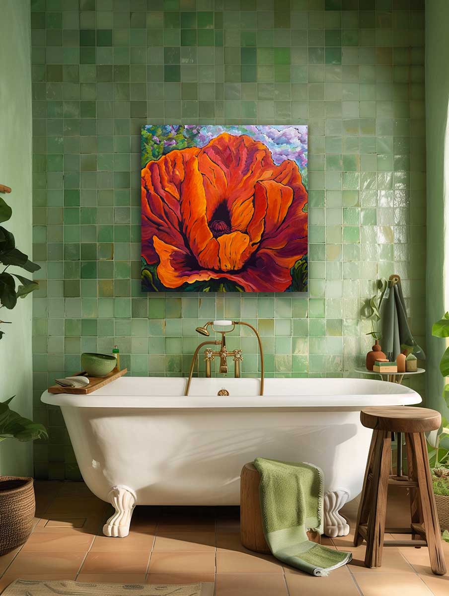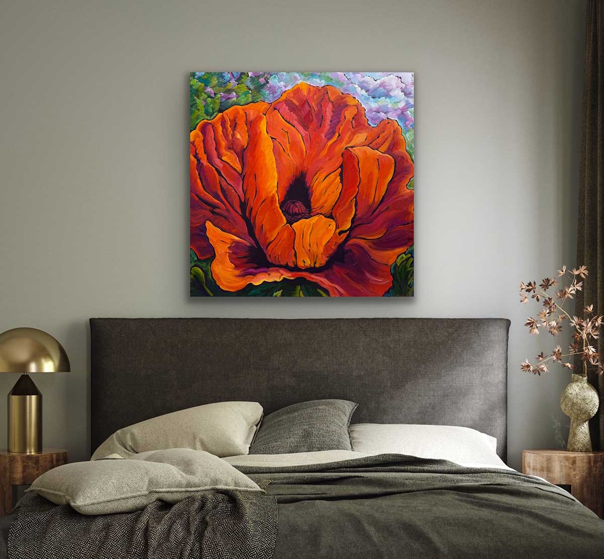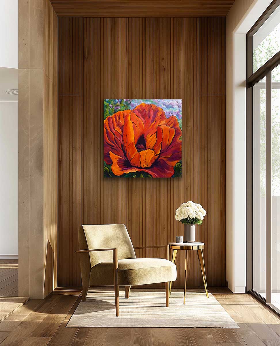 Oil on Canvas – PoPPiness 40 x 40 – I personally feel better when I have a Poppy in my collection of paintings to offer. They just feel so good. Rich and Warm.