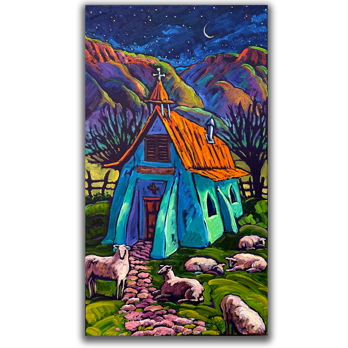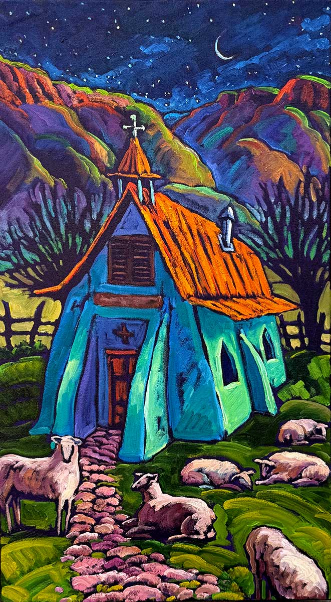 Oil on Canvas – The Silent Night 18×30, I love these night paintings, I work on these in my studio, using themes I love, like flocks (sheep or chickens or pigeons) around a chapel… This painting has been chosen for the Taos Banner Project, ‘Look For It’ along the streets of Taos this winter, 2025/26.