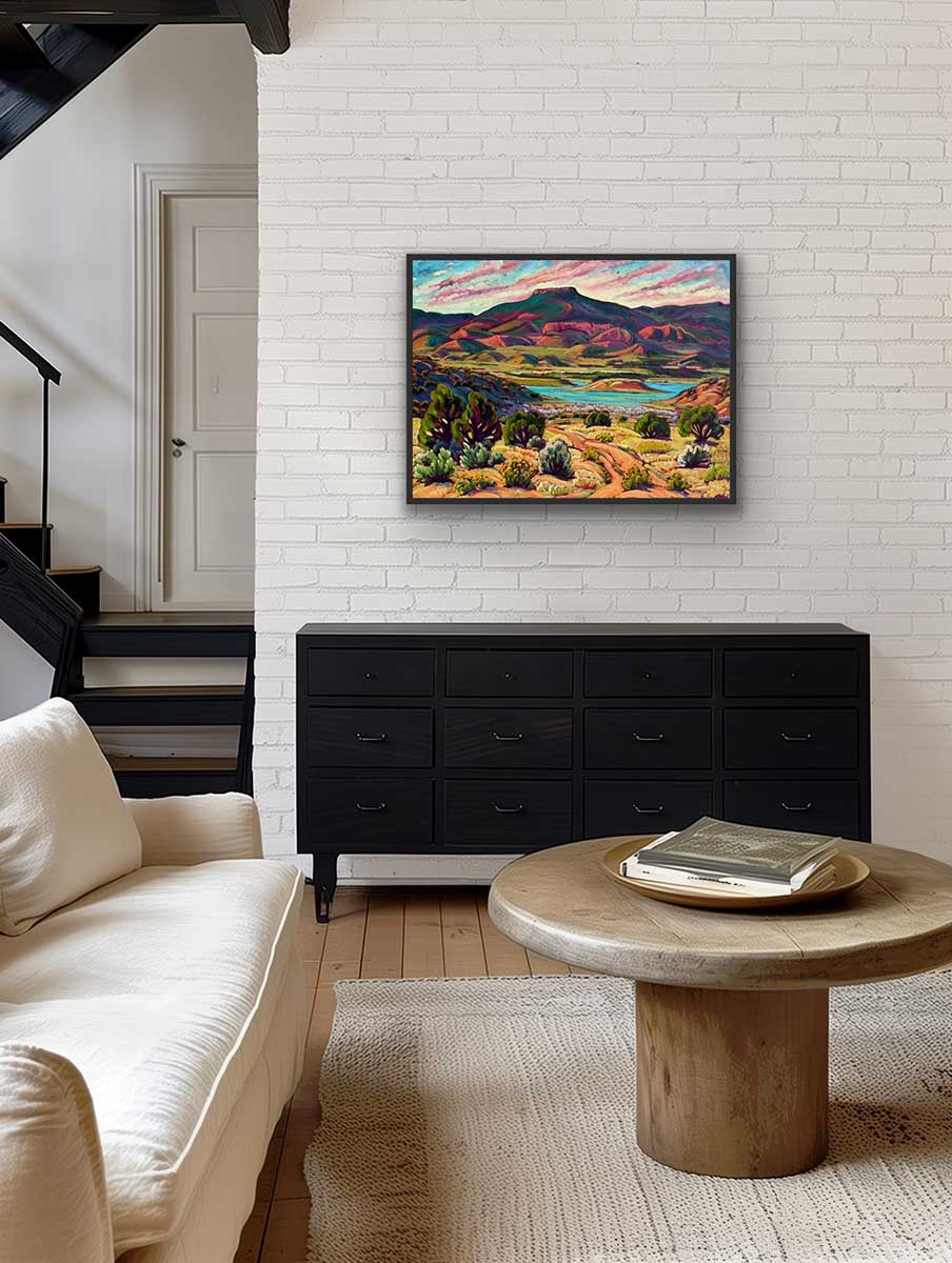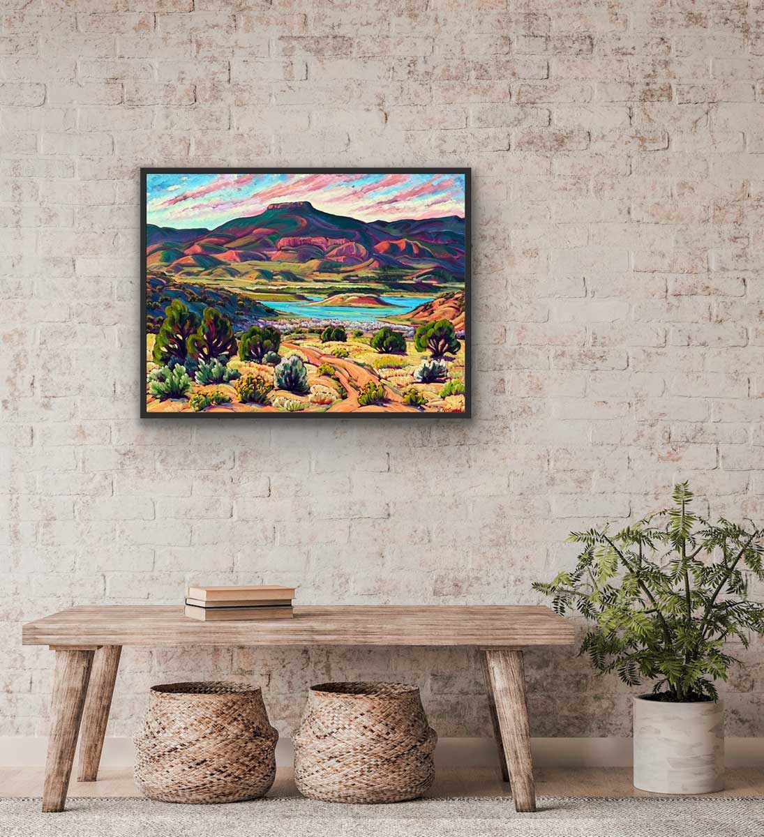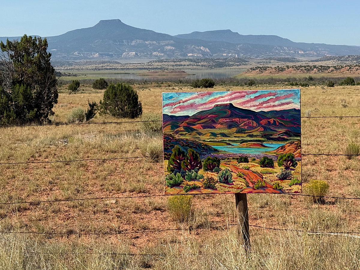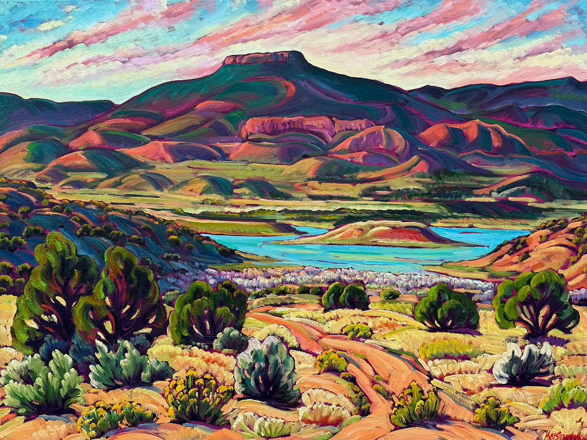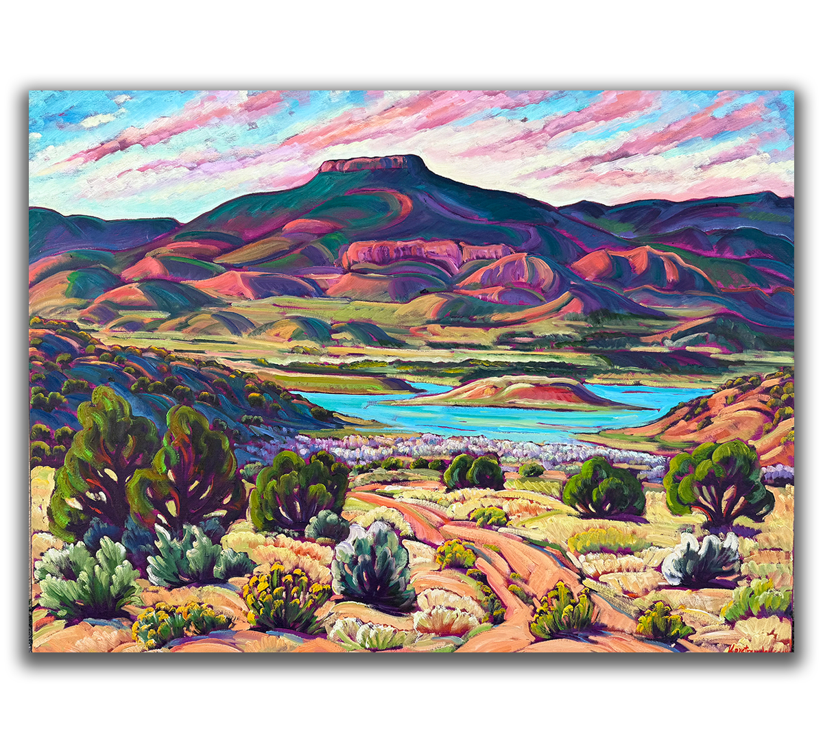 Oil on Canvas – The Cerro Pedernal Dawn 30×40, when I know the morning clouds are going to be good, I can’t sleep, so I go paint. Two times on location to catch that morning pink light. Georgia O’Keeffe made many paintings of Cerro Pedernal (Flint Hill), and her ashes were scattered on its top.