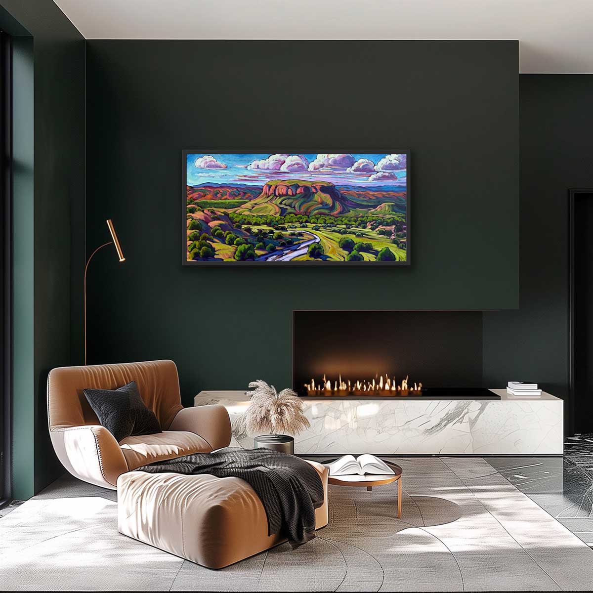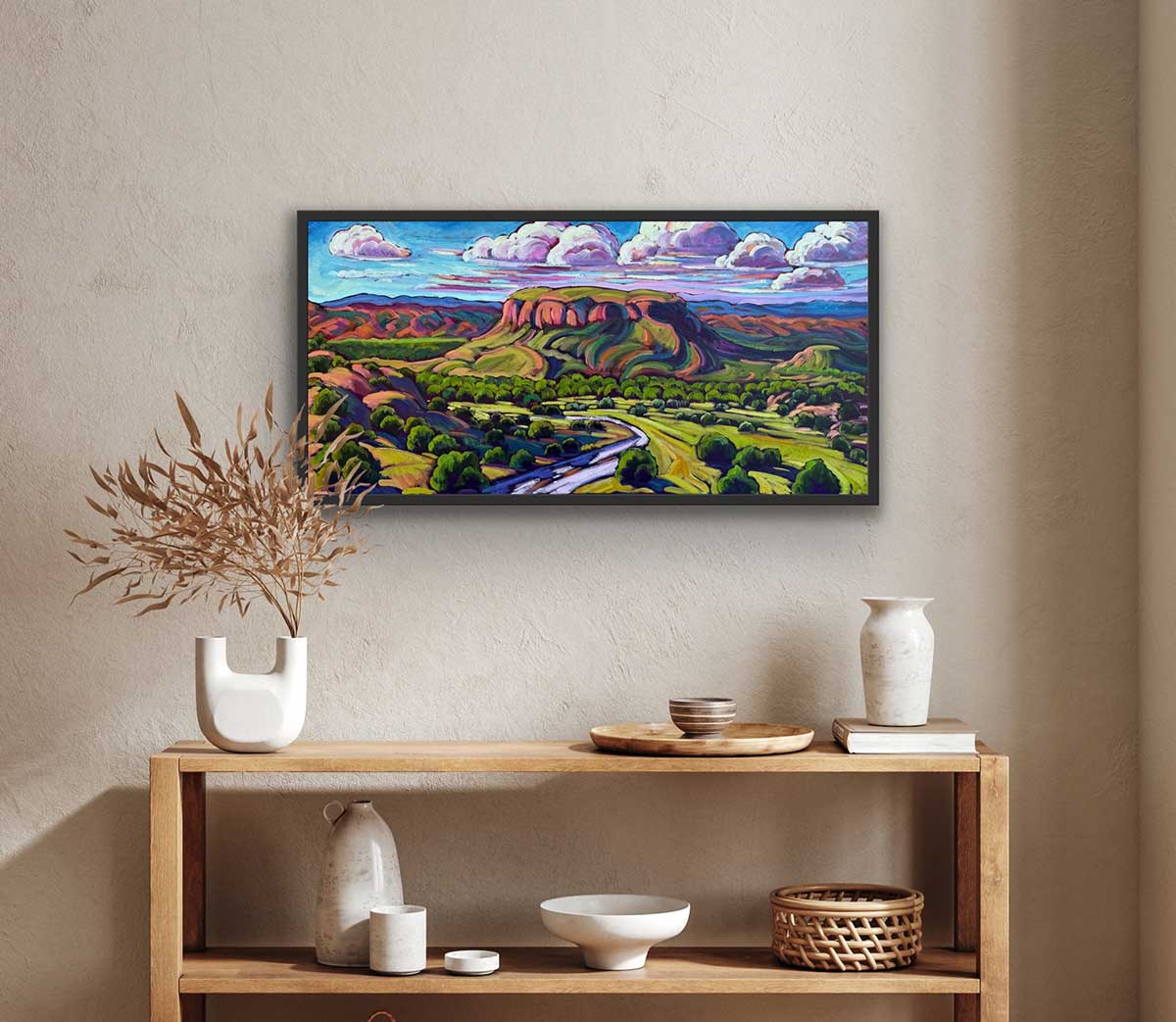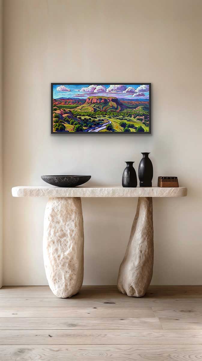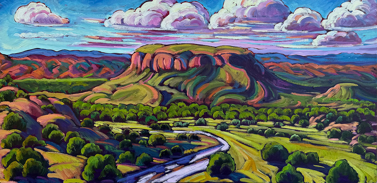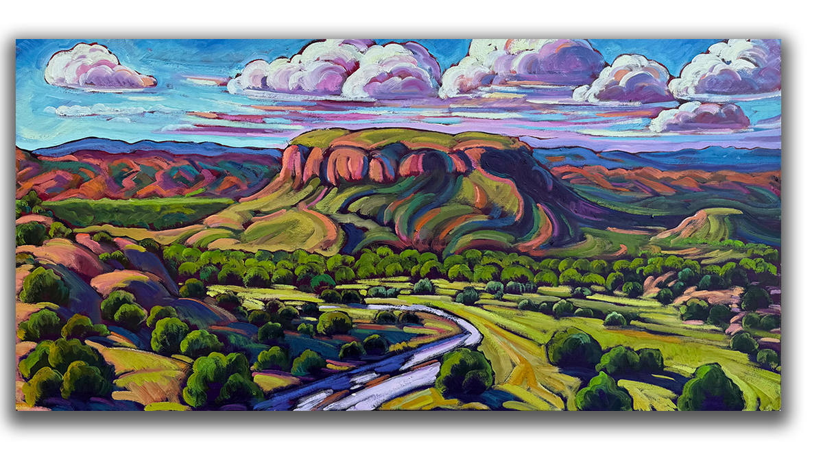 Oil on Canvas -The Skies of Black Mesa 20 x 40, What a beautiful place, I drive by Black Meas often and marvel at it’s unique beauty and look forward to painting it many times.